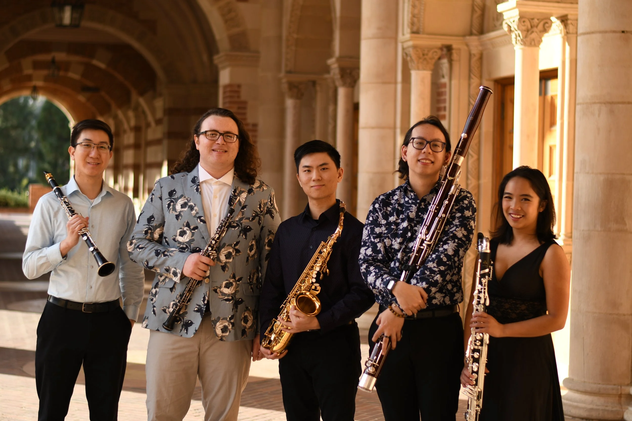 Fivemind Reeds is a Los Angeles-based reed quintet with saxophonist Alexander Lee, clarinetists Darren Liou and Kristine Llanderal, bassoonist Matthew Rasmussen, and oboist Thacher Schreiber. Formed in 2021 at UCLA’s Herb Alpert School of Music, they have since performed in several concerts and recitals throughout Los Angeles and the United States. Fivemind was a featured ensemble at the 2022 Imani Winds Chamber Music Festival in New York City, and has premiered works by composers such as Rutgers University Professor Nadine Silverman, UCLA doctoral candidate Madeline Barrett, and Fivemind’s own Thacher Schreiber. Most recently, Fivemind was ensemble-in-residence for Interlochen Public Radio’s Sound Garden Project, planting classical music in unexpected places through innovative programming and performances. The quintet maintains a colorful and diverse repertoire, including works by David Biedenbender, Ton der Doest, Marc Mellits, Jeff Scott, and Octavio Vazquez.